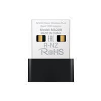 Mercusys MA20N AC650 Nano Wireless Dual Band USB Adapter Dual Band Wi-Fi Speed Speeds up to 433 Mbps (5 GHz) + 200 Mbps (2.4 GHz) Plug and Play With the built-in inbox driver by Windows operation systems, you just need to plug into your computer and play. Nano Size A compact, convenient solution to make your device wireless. Much smaller than a regular USB flash drive. Improved Security The latest security enhancement, WPA3, provides enhanced protection in personal password safety Windows Compatible Supported operating system: Windows 10, 11 (32/64bit) Specifications Wireless Wireless Standards IEEE 802.11ac, IEEE 802.11a, IEEE 802.11n, IEEE 802.11g, IEEE 802.11b Frequency 5 GHz 2.4 GHz WiFi Speeds Up to 433 Mbps on 5 GHz Up to 200 Mbps on 2.4 GHz Reception Sensitivity 5GHz: 11a 6Mbps: -95dBm 11a 54Mbps: -78 dBm 11ac VHT20 MCS8: -72 dBm 11ac VHT40 MCS9: -68.5dBm 11ac VHT80 MCS9: -64.5 dBm 2.4GHz: 11g 6Mbps: -95.5 dBm 11g 54Mbps: -79 dBm 11n HT20 MCS7: -76 dBm 11n HT40 MCS7: -74 dBm Wireless Security WPA/PSK, WPA2-PSK, WPA3-SAE Hardware Dimensions 14.94x7.19x19.15mm Interfaces USB 2.0 Antenna Type 1 Internal Antenna Others Package Contents AC650 Nano Wireless Dual Band USB Adapter (MA20N) Quick Installation Guide System Requirements Windows 11/10 (32/64-bit)